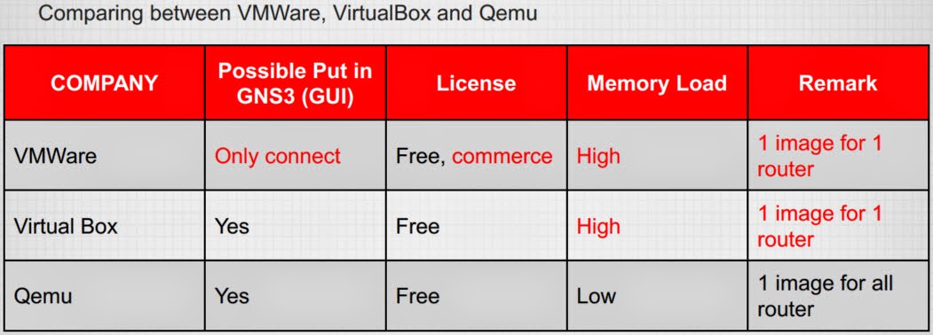 kekurangannya. Berikut perbandingan software Virtual machine untuk GNS3 :